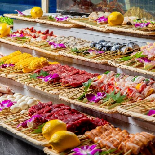 日替わりでご用意する全30種の串焼きは、和牛・海鮮・旬野菜を厳選し、一本一本丁寧に仕立てた贅沢な逸品。炭火で香ばしく焼き上げることで、素材本来の旨みと芳醇な香りを最大限に引き出します。彩り豊かに並ぶ串の数々は、まさに圧巻のひと皿。お好みの一本をお選びいただき、心ゆくまで至福のひとときをお愉しみください